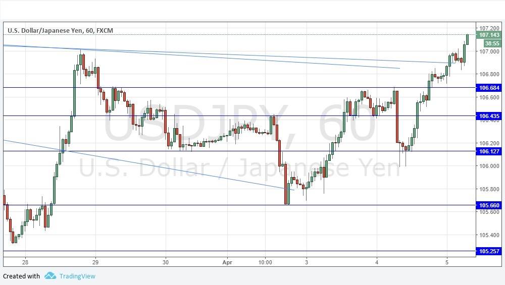 Yesterday I took a bullish bias above 106.44. This worked out well, as the price continued its rise. However, I also noted that 107.00 could act as resistance, but if the price got above it that would signify the bulls were in strong control. This is what happened, as the price has become established above 107.00 after a little initial resistance which held for a few hours. I have a stronger bullish bias today. There are no key support levels until 108.05 so the price has plenty of room to rise higher. Watch out for possible resistance though at 107.50 as it is a key psychological level.