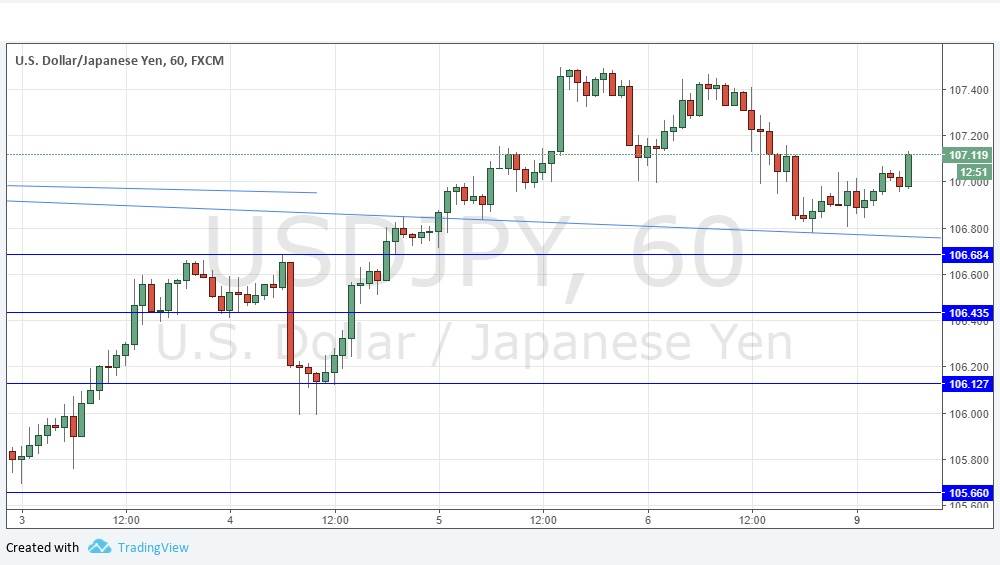 I took a bullish bias last Thursday. The price hasn’t really risen any further since then, but it has not fallen either, and is holding up above the new support levels, and is using the broken bearish trend line shown in the chart below as a supportive platform to push higher. I had thought 107.50 might halt the advance for a time as a key psychological level and I was right about that, and the next level is at 108.05. It now looks as if the price will rise to challenge 107.50 and possibly beyond, so I again take a bullish bias today.