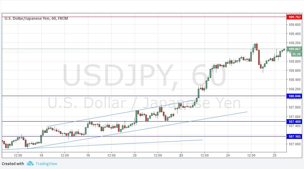 I had a bullish bias yesterday, due to the strong break above the former resistance level of 108.05 which had held for a long time. The price reached a new high of 109.20 before pulling back quite sharply but then rising again. However, the price has still not got back to its former high. There is no reason to stop being bullish, but the move up might well slow down now. There is no obvious strong support level below until 108.05, but 108.50 has been used as latent support by buyers so it might hold if the price falls back to it. The long-term bearish trend is technically over, with the price reaching levels above its price of three months ago.