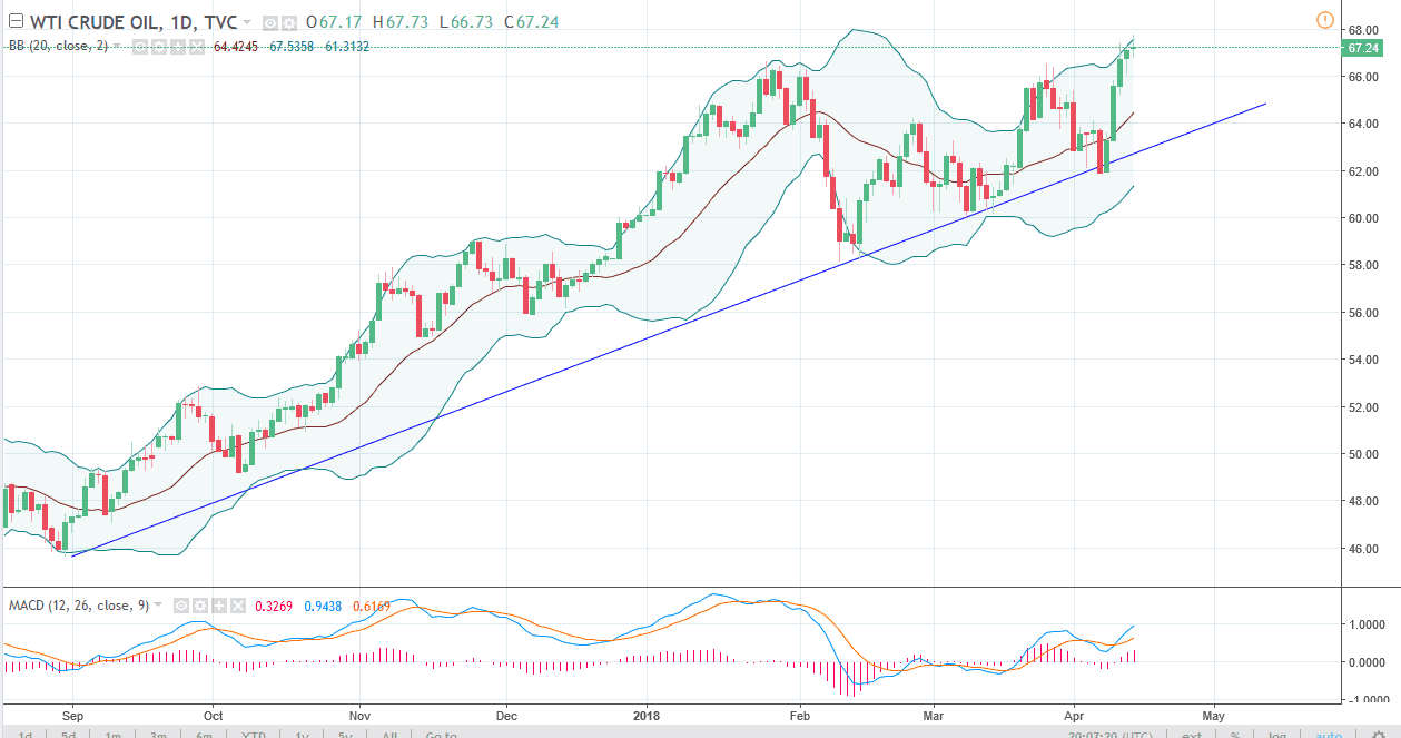 The WTI Crude Oil market continues to try to go higher during the trading session on Friday, but as you can see struggled a bit. The $68 level should continue to be an area of resistance, but I think if we can break above that level, I think that the market should then go to the $70 level. I believe that short-term pullbacks will be a buying opportunity, as the uptrend line has kept this market intact to the upside. I think that if we were to break down below the uptrend line, then of course things change. I believe that the market should have plenty of support at the $66 level, and if the US dollar can continue to struggle, that could also send this market higher. With tensions in the Middle East, it’s likely that oil will continue to have a bit of a bit underneath it.