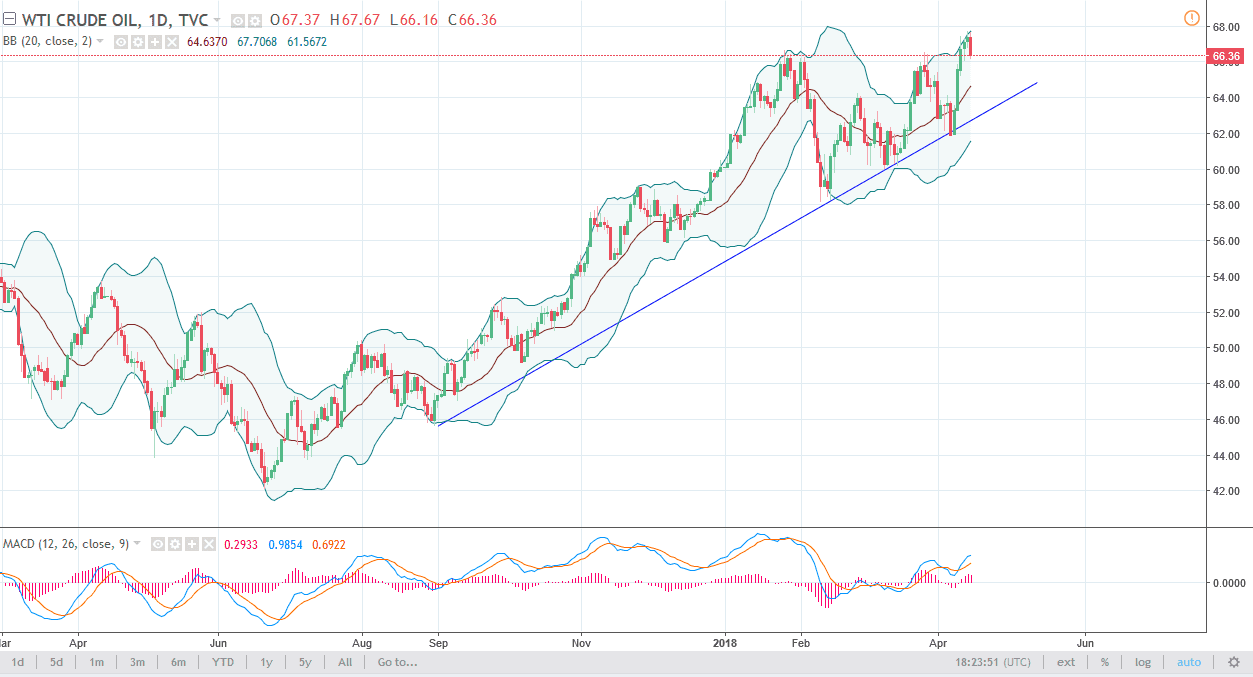 The WTI Crude Oil market pulled back slightly during the trading session on Monday, losing 1.6% by the time the markets closed for the day. The uptrend line underneath should continue to be supportive, and I think that it’s not until we break down below that level that we can start selling. I think that we have simply ran out of momentum, as we reach the top of the Bollinger Band. I’m looking for supportive candles underneath, and on signs of support or a supportive daily candle, I am more than willing to start buying again. The $64 level should also be supportive, just as the $66 level will be as it was previous resistance. I think ultimately, this market will go looking towards the $70 level above, so look for value to take advantage of. A falling US dollar will exacerbate this move if we do in fact see that.