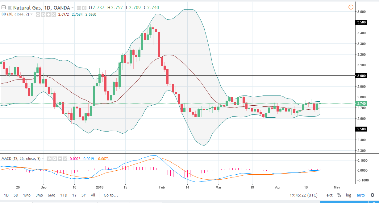 Natural gas markets went back and forth during the trading session on Monday, as we continue to hover around the $2.75 level. The market looks likely to try to go higher based upon the candle shape, but I believe that the $2.80 level is massive resistance. If we can break above there, I think that we could go higher, perhaps reaching towards the $3.00 level above. That is an area that even more resistive, so I am waiting for exhaustive candles on short-term charts to continue to short the natural gas markets, as we are so tightly wound up. I do believe that the oversupply issue continues to be a problem, and that of course the temperatures in the United States and Canada are starting to turn higher, and that drives down demand significantly in the natural gas world.