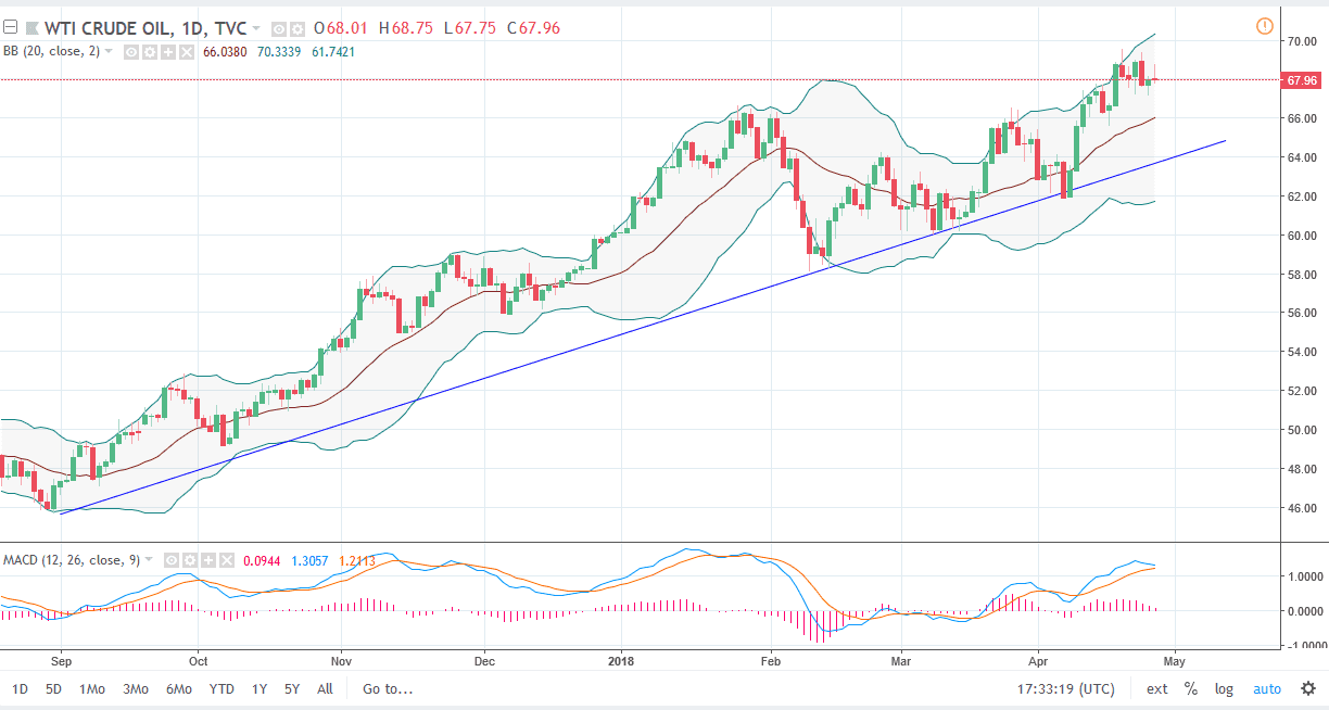 The WTI Crude Oil market tried to rally during the day on Thursday but gave back most of the gains. We are hanging about the $60 level, and I think what we are trying to do is build up enough momentum to finally break above the $70 handle. I think short-term pullbacks will continue to be buying opportunities, as there is a strong uptrend line underneath, and of course horizontal support at not only the $68 level, but perhaps the $66 level. If we finally do break above the $60 level, the market should continue to go much higher, perhaps reaching towards the $75 level over the longer term. I think if we did finally break down below the uptrend line underneath, then it would be time to start selling, but currently it looks as if the buyers are willing to come in and pick up value as geopolitical concerns continue to drive the price of oil up higher.