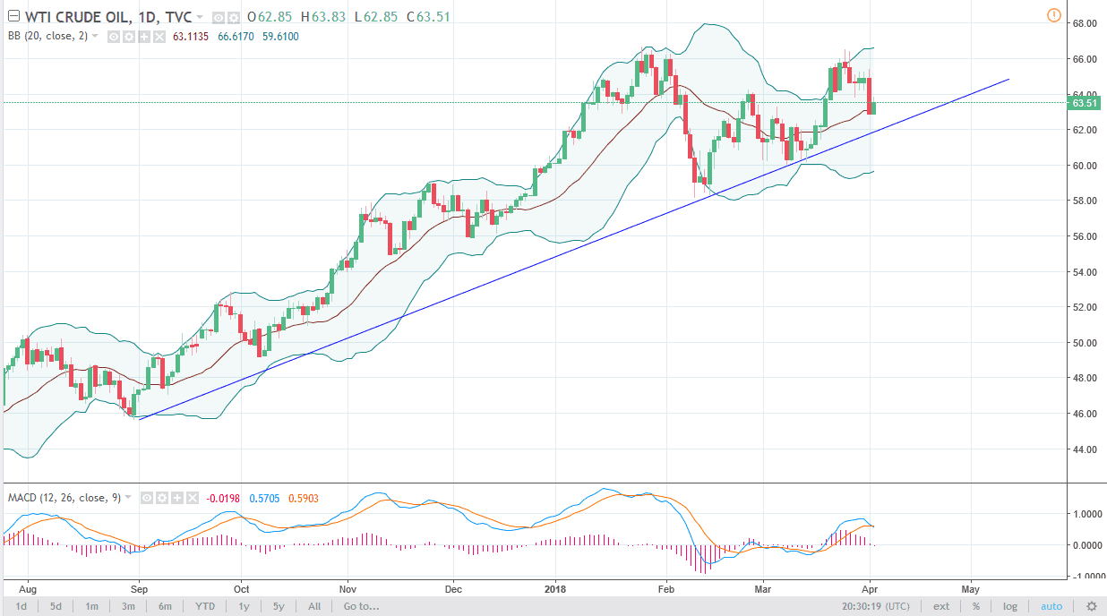 The WTI Crude Oil market bounced over 1% during the trading session on Tuesday, partly in reaction to the oversold condition that Monday left us in, but also as we went reaching towards the uptrend line. I believe the uptrend line will be very important, and I think that if we break down below the uptrend line, the market will probably go looking towards the $60 level initially. However, we could bounce from this uptrend line, and I think that if we can stay above it, the market should continue to reach towards the $66.50 level again. This is a market that I think continues to be very noisy, and therefore buying on the dips if we can stay above the uptrend line is the best way to go. We would be best served by trading small positions in the meantime. Otherwise, if we break down below that uptrend line think things could get rather ugly.