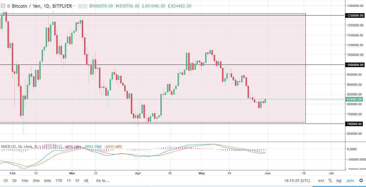 Bitcoin rallied against the Japanese yen as well, reaching towards the ¥825,000 level. The market still sees a significant amount of resistance near the ¥850,000 level, and most certainly at the ¥900,000 level. I think that the market will eventually find sellers, especially if the whole situation with global trade can calm down, or if we get some type of melt down in the USD/JPY pair, as it would send many looking for the Japanese Yen overall. The market would then go looking towards the ¥700,000 level underneath which is the bottom of the longer-term consolidation. I don’t have any interest in buying this pair, at least not right now while things are so skittish. If I was going to buying Bitcoin, it would probably be against either the US dollar or the Euro.