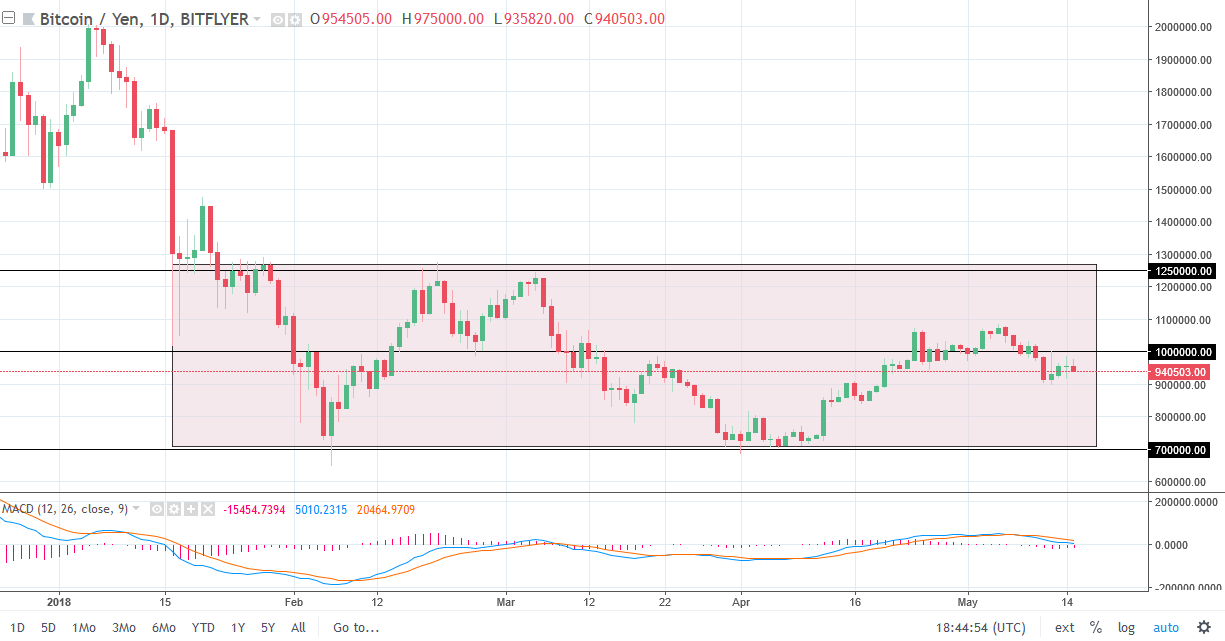 Bitcoin try to rally against the Japanese yen as well but turned around of form a somewhat negative candle. The market looks likely to continue to drift towards the ¥900,000 level. The ¥1 million level above is resistant, and of course a psychologically important number. I believe that if the market somehow breaks above the ¥1.1 million level, we will go reaching towards ¥1.25 million level. Having said that, the Japanese yen got pummeled against the US dollar during the day, the benchmark for the Japanese yen, but even with a soft Japanese yen, bitcoin could rally. That tells me that we are running into some serious trouble again. I suspect short-term selling is to be found.