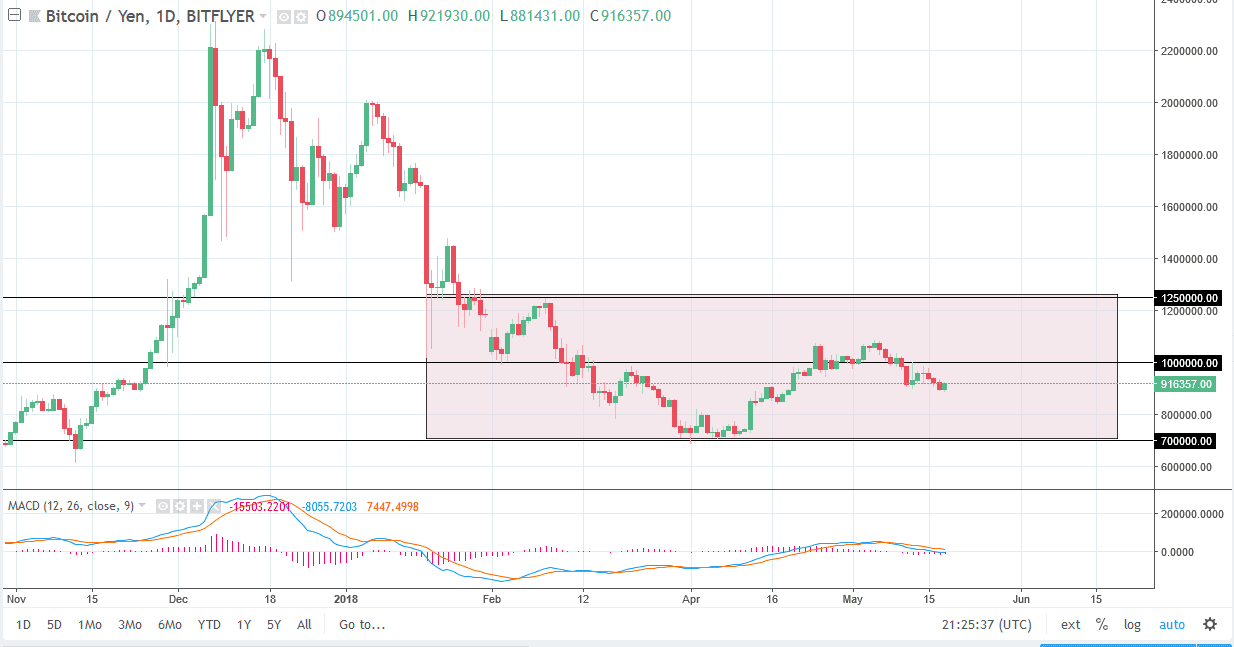 Bitcoin rallied slightly against the Japanese yen as well but continues to look very suspicious to say the least. If we can break down below the ¥900,000 level, it’s likely that we will continue to go lower, aiming for the ¥800,000 level, and then the ¥700,000 level which is the bottom of the overall consolidation. If we do rally from here, I anticipate that the ¥1 million level could be a bit of trouble as well, extending to the ¥1.1 million level. Break above there should send the market towards the ¥1.25 million level. This is a market that is very volatile, so if you are planning on buying bitcoin against the Japanese yen, perhaps you need to see some type of pullback to offer a bit more value to get involved as you will almost certainly have to ride the move through a lot of noise.