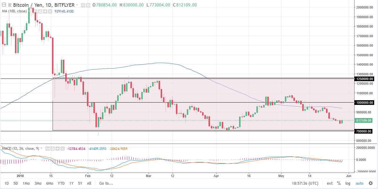 Bitcoin rallied a bit against the Japanese yen as well, which of course coincides nicely with overall bitcoin strength. The ¥900,000 level above should be resistance though, just as the 100-day moving average is sitting just above there. I believe that the “ceiling” in the market is probably closer to the ¥1 million level, so I’m waiting for signs of exhaustion to start shorting again. I believe that we will go looking towards the ¥700,000 level, completing the move to the lower part of the consolidation. The market failed to reach the highs of the overall consolidation area that I have marked out on the chart, at least the last time we attempted to. Because of this, I suspect that we will see plenty of selling that eventually, and this is typically a very negative sign longer-term. I have no interest in buying.