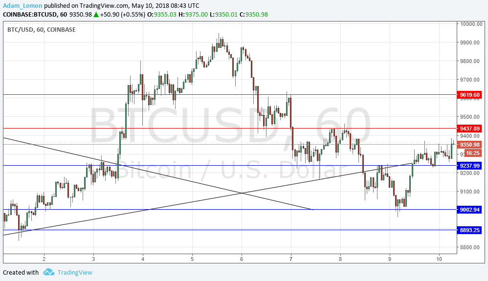 I wrote yesterday that I saw price action as quite evenly balanced between bulls and bears, but that I would have a bearish bias if the price could break convincingly below $9,000. In fact, the $9,000 area saw the low of the day, and the price has continued to advance, printing new higher support at $9,238. However, the price now seems to be established within a small zone where it can be expected to consolidate, so I again have no bias.
