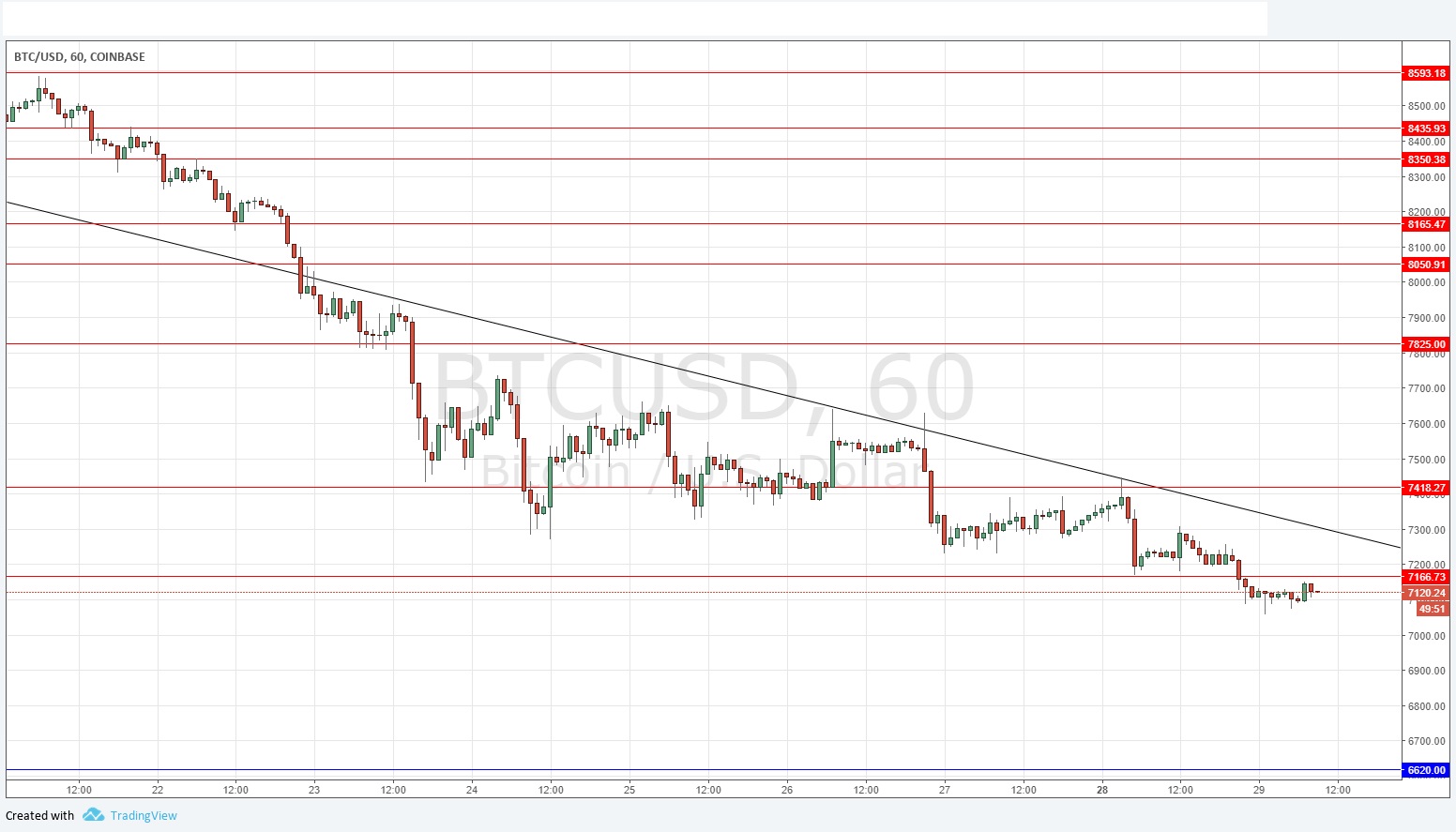 I wrote yesterday that I had a bearish bias below $7,418. This worked out well, as the price never exceeded that level, and has continued to fall to make new low prices. The former support at $7,167 has broken down and now looks to have been flipped to become new lower resistance. Prices have not been at these levels for some weeks, so the push down driven by the descending trend line is in blue sky. There is no reason to be anything other than bearish below $7,418 even if price breaks above the trend line again. There are no key support levels until $6,620 so the price has a long way to fall without encountering any obstacles.