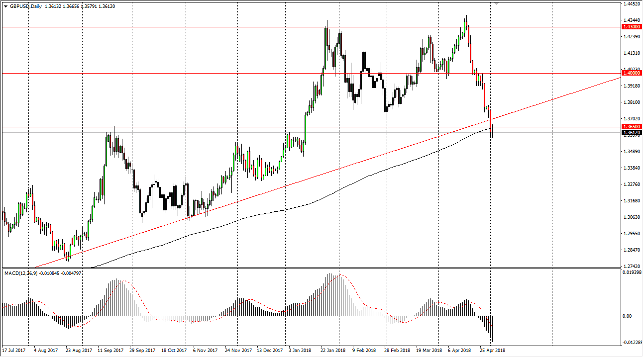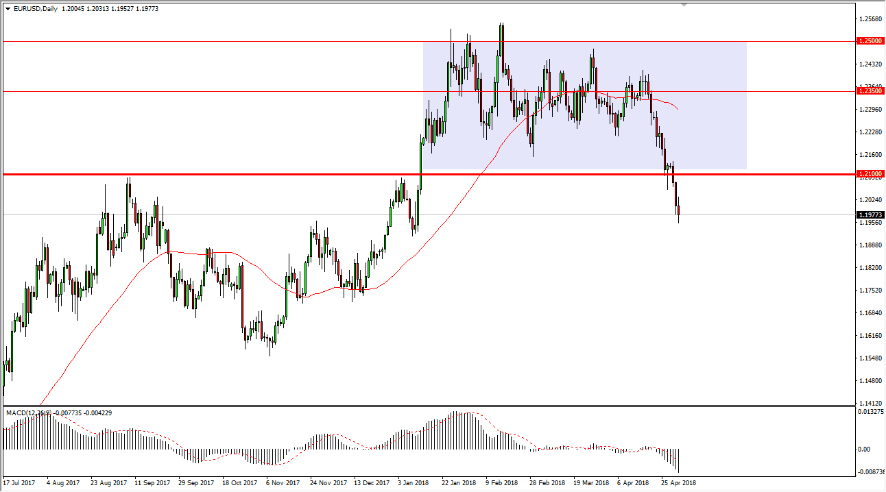 The EUR/USD pair broke down a bit during the day on Wednesday but found support near the 1.1950 level as the FOMC statement came out relatively benign. The 1.21 level above should continue to be resistance as it was previous support, and I think that bounces that happen in this area will more than likely find a lot of selling pressure near that area. I believe in selling rallies as they occur, unless of course we can break above the 1.2150 level. If we break down below the bottom of the hammer like candle for the session, that probably allows this market to go down to the 1.18 level. However, I suspect that this is simply a function of traders looking to close out positions ahead of the vital jobs number coming out tomorrow.