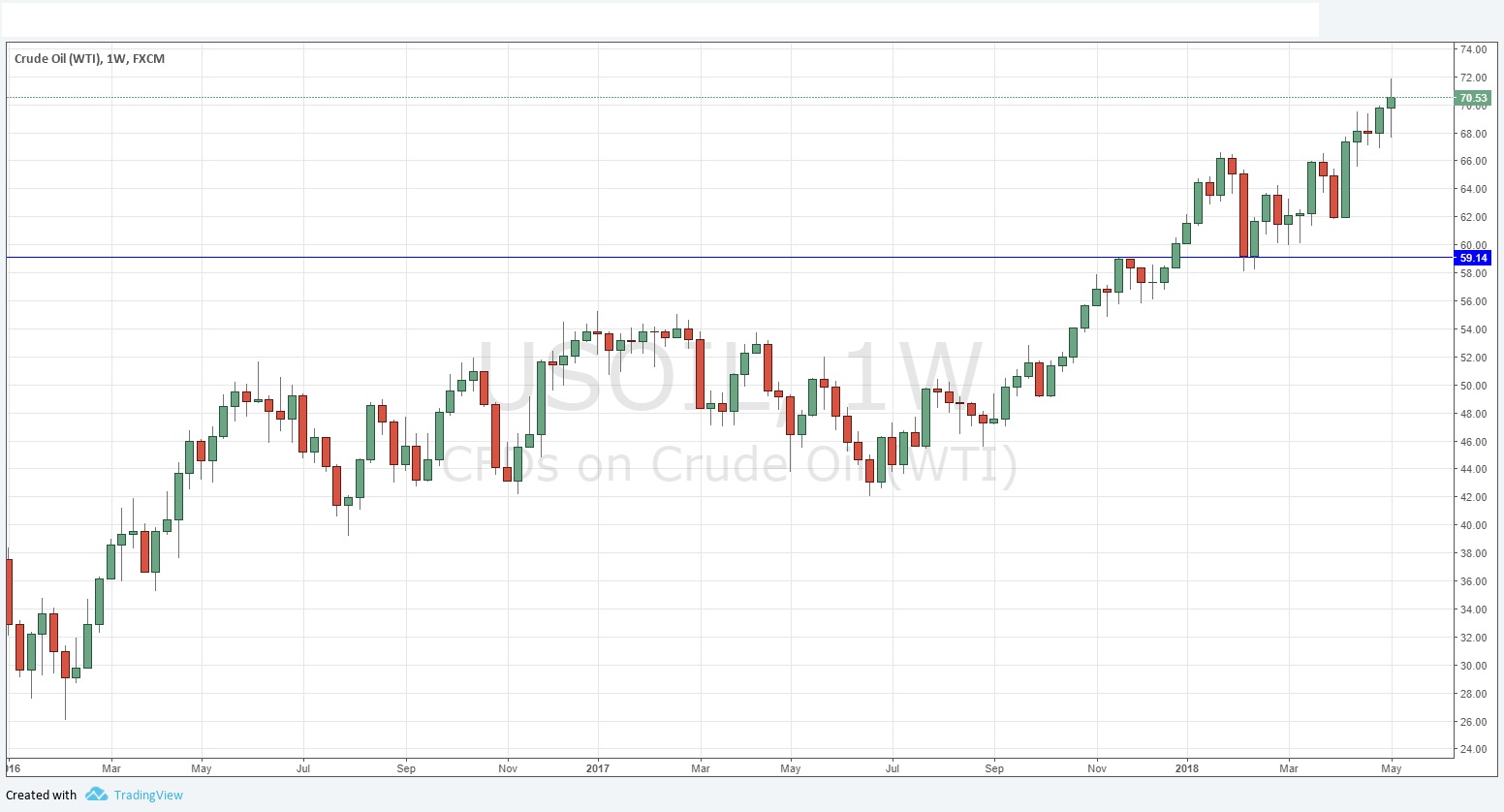 The weekly chart below shows the price again made a new 3-year high. There is a strong, long-term bullish trend here, although with tensions in the Middle East decreasing somewhat, there is greater chance of a bearish pull back. The candlestick also did not close near its high. However, there is still bullish momentum here, and it’s a respectable trend trade.