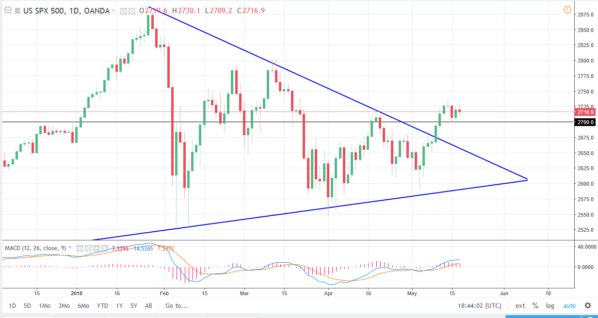 The S&P 500 has gone back and forth during the day on Thursday, forming a neutral candle. The market has recently trying to rally, but it also pulled back a little bit. It looks as if the 2700 level is offering a significant “floor” at the short-term interval, and we have recently made a “higher high” at this point. Beyond that, the downtrend line underneath should be supported. I believe it’s only a matter time for the buyers get involved though, so if we can break above the 2740 handle, the top of the shooting star from a couple of trading session to go, that would be a very bullish sign it should free this market to go much higher. I believe eventually the buyers return and pick up a bit of value as it presents itself.