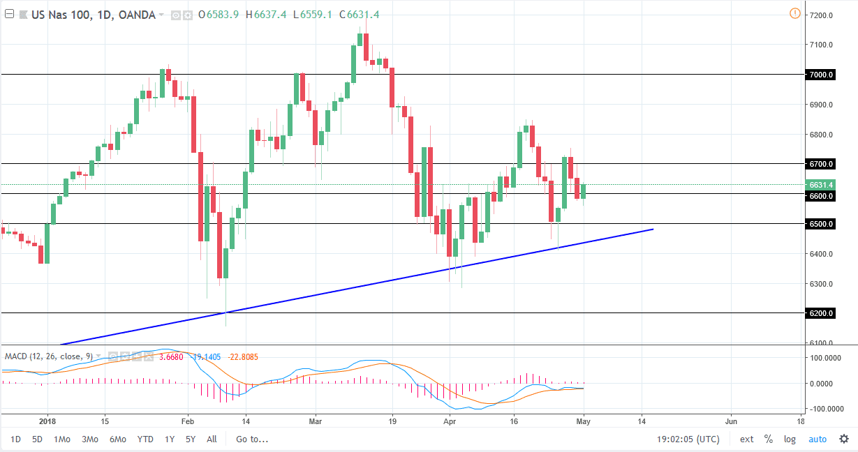 The NASDAQ 100 initially fell during the day but then rallied quite nicely to break above the 6600 level, showing signs of life as we reached towards the 6650 level. If we can break above the top of the candle for the day, we should then go to the 6700 level, which is the next major figure. I think at that point, we would see a certain amount of resistance, but between now and the jobs number would not surprise me at all to see a little bit of positivity. Part of this has been driven by Intel beating estimates, but at the end of the day I think that a lot of traders are hesitant to be short of the market ahead of the jobs number. If we were to break down below the 6450 handle, extensively the uptrend line, then I think the market unwinds quite drastically. As things stand now though, I think it’s a buy on the dips market still.