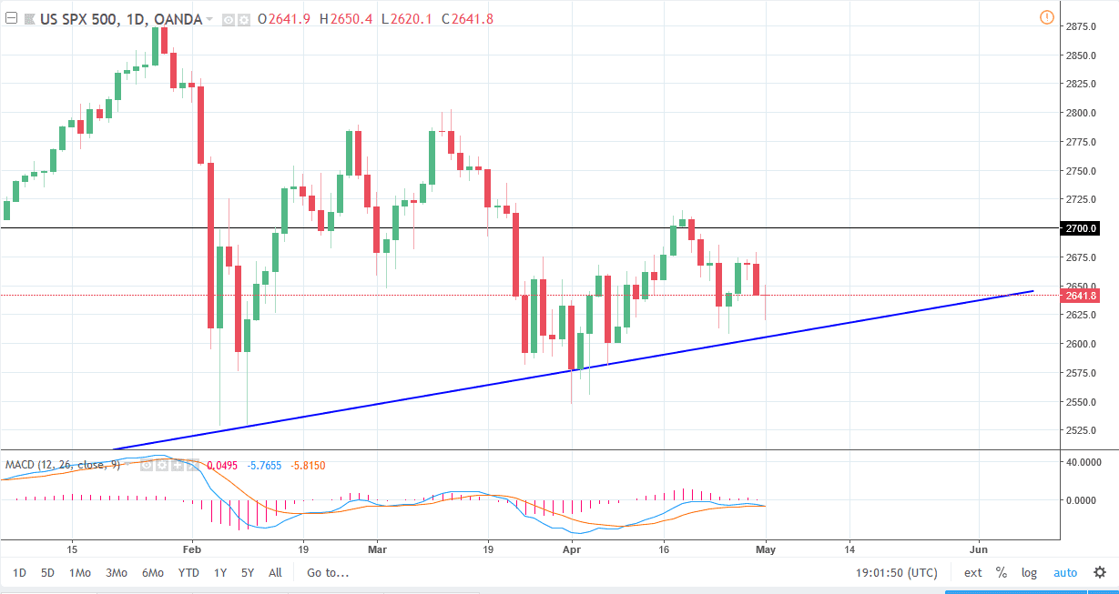 The S&P 500 had a rough trading session initially on Tuesday, as we reached to much lower levels, but found the area just above the daily trendline to be supportive enough to turn things around and form a hammer. The hammer of course is a bullish sign and I think that the attitude of traitor shows a certain amount of resiliency. I believe that the markets will probably be a bit choppy between now and Friday, as it is Nonfarm Payroll Friday, which of course causes a lot of noise. I think that we are trying to turn around and go to the 2675 level, but it’s going to be very difficult. Short-term pullbacks are probably buying opportunities, but if we were to break down below the 2600 level, the market probably unwinds rather drastically.
