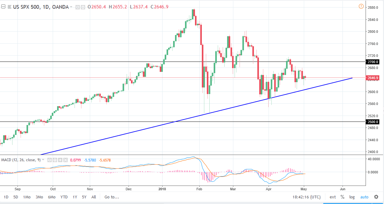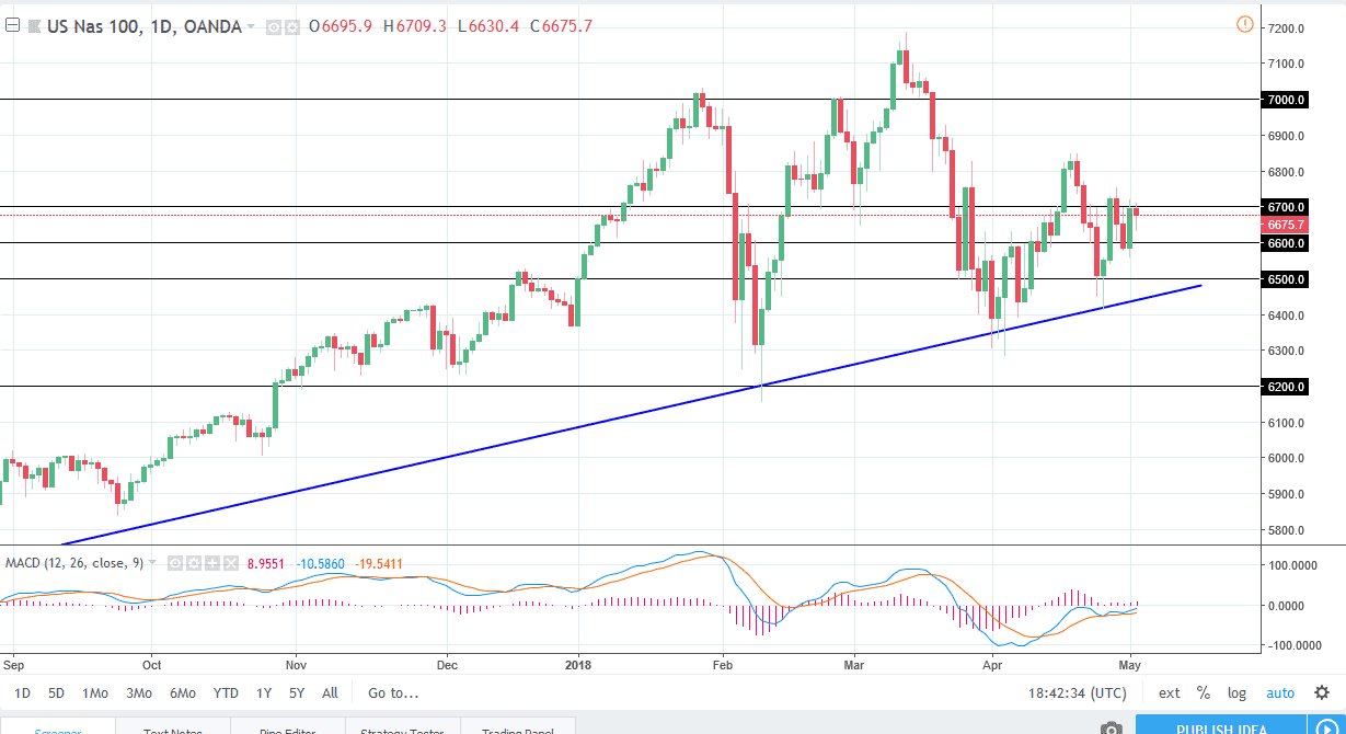 The S&P 500 rallied after initially falling during the trading session on Wednesday. When it up relatively unchanged, showing the 2040 level as support. The hammer from the previous session of course offering support as well, and the uptrend line that you can see I have on the chart. I think that the market is going to be very quiet today though, because tomorrow is the jobs number. I believe that we do have an upward proclivity longer-term, if we can stay above the uptrend line underneath. If we were to break down below the 2600 level, that could unwind this market to the 2500 level, which could be very negative. A breakdown below that level would unwind this entire attitude and wipe out the bullish trend that we have enjoyed for quite some time. Today though, I would expect much one way or the other.