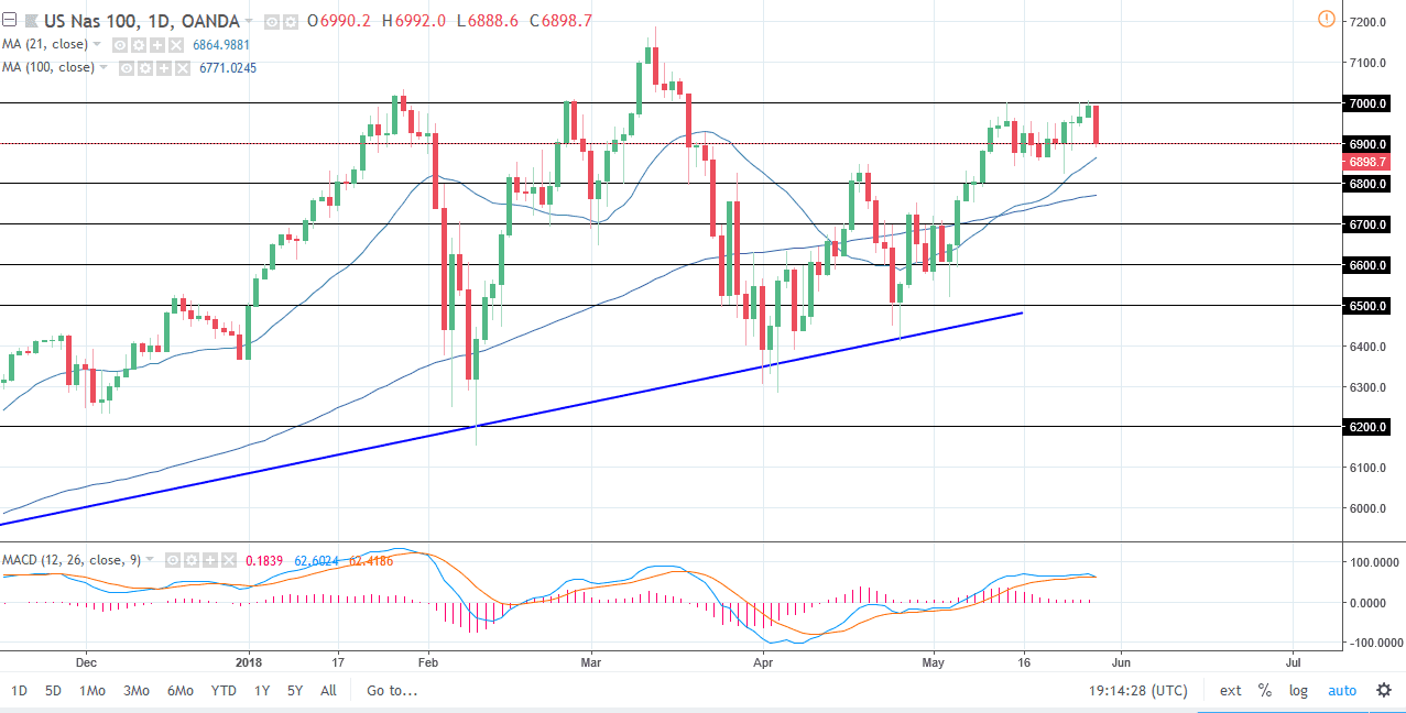 The NASDAQ 100 has fallen during the day as well, reaching towards the 6900 level before finding some stability. Because of this, I think it’s only a matter time before the buyers come back and we start going higher, as there are plenty of support of levels just below. The 100-day moving average is closer to the 6800 level, so we could drop down to that level, but I suspect that the buyers are more than likely going to continue to run the show either way. I like the idea of going long and aiming for the 7000 handle, which has been recent resistance. Ultimately, I think that the market needs to pullback to build the necessary momentum, and that’s essentially what we are seeing.