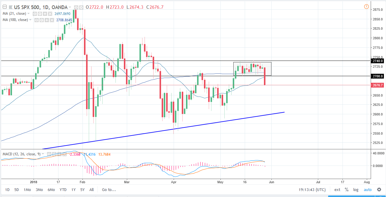 The S&P 500 has broken down rather significantly during the trading session on Tuesday as traders came back to work from the Memorial Day holiday. By breaking through the 2700 level, it looks as if we are going to continue to reach lower, but quite frankly I think this is an opportunity to take advantage of cheap pricing. Ultimately, when you look at this chart you can see that there is a significant uptrend line underneath, and we have recently made a “higher high.” Obviously there is a lot of volatility in the markets, but that is something that isn’t that out of the ordinary. I like buying these dips, but I would be very cautious about jumping in right away. I suspect that we will have opportunities to buy this market at lower levels. I’m not willing to short this market, although I do recognize that we will more than likely sell off initially. I’m looking for stability and a bounce from lower levels.