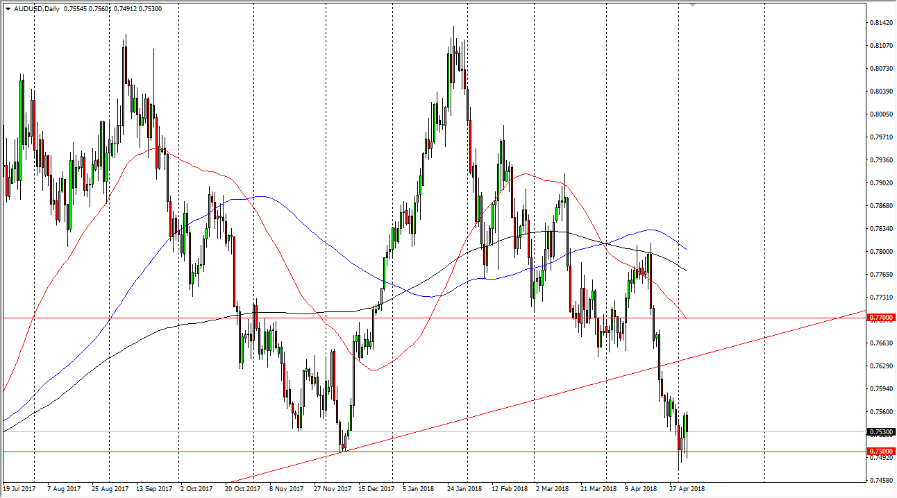 The Australian dollar has been very noisy during the trading session on Friday, bouncing from the 0.75 handle. This is an area that is of course a large, round, psychologically significant number. I think that if we bounce from here though, we will probably have a significant amount of resistance at the previous uptrend line. I think that the market breaking above there would be a good sign, but it’s not until we clear the 0.77 level that I’m interested in buying. If we break down below the lows from a few sessions ago, then I think the market unwinds to the 0.7350 level. That of course is a support level based upon longer-term technicals, so it’ll be interesting to see what happens there. Pay attention to interest rate markets in America, if they continue to offer more yield, that will put downward pressure on this market.