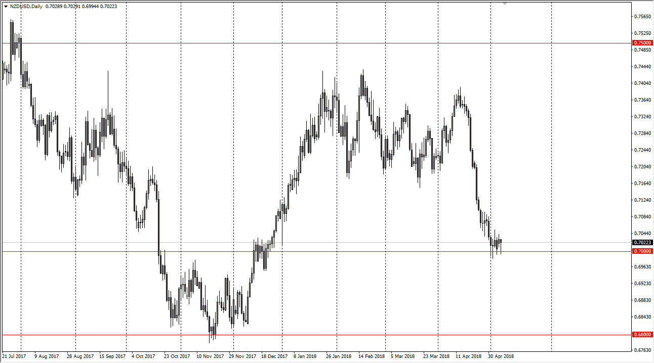 The New Zealand dollar initially fell during trading on Monday but found the 0.70 level to be supportive again. The level of course has a certain amount of psychological significance, but in the end I think the real support overall is closer to the 0.68 level, as it is support from the last several years. We have just started to make a ‘round trip’, and the bottom of it has been hit quite yet. Because of this, I think that we will eventually break down and reach towards the bottom of the overall consolidation area, but I don’t think that we will be a way to break down below there. Ultimately, I think that the usual correlations will hold for the New Zealand dollar, as the commodity markets are course are highly influential with the Kiwi. In general, I think this is more about higher interest rates in America, and I think that rallies will offer selling opportunities.