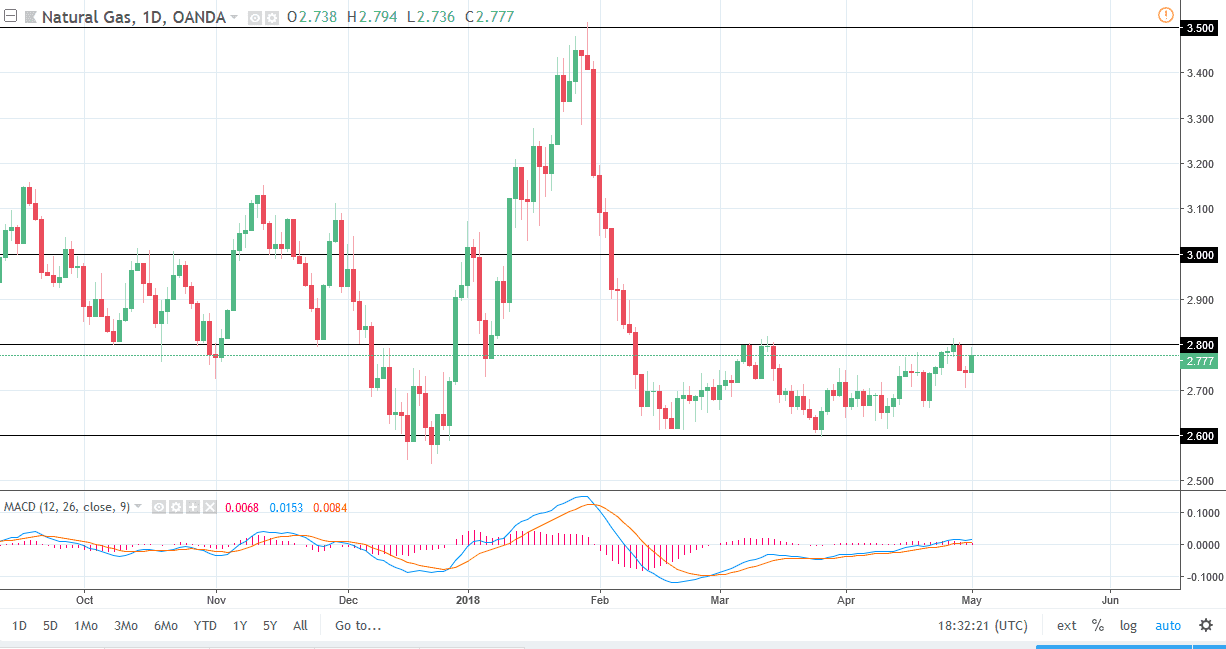 Natural gas markets rallied quite significantly during the session on Tuesday, reaching towards the vital $2.80 level. This is an area that has been resistive in the past, but it looks like we are trying to break above it. If we could break above the $2.82 level, I think that the market probably goes to about the $3 level above, which is even more resistive in my estimation. I think that short-term traders will probably look for short positions, but a move above the $2.82 level might bring in momentum traders trying to push the market much higher. The $2.70 level has been shown as support based upon the hammer for the day, so obviously it’s something to be paid attention to. Longer-term though, I anticipate we will go looking towards the $2.60 level.