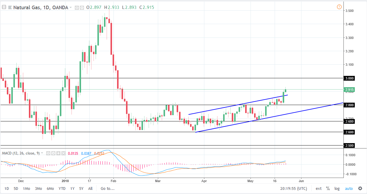 Natural gas markets broke to the upside during the trading session on Wednesday, reaching towards the $2.93 level above. The markets continue to be very bullish, and I think that breaking above the top of the up trending daily channel should continue to push this market higher, perhaps reaching to the $3.00 level. I believe that every time we rally, there will eventually be sellers coming back in, but in the short term it looks as if the market is going to continue to reach the higher levels. I think that the $2.87 level underneath should be support, as the uptrend line should offer support now. Longer-term though, I do believe that the sellers come back as we will be oversupplied eventually, but the hotter temperatures in the United States has driven short-term use higher.