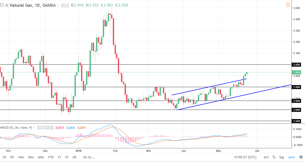 Natural gas markets initially fell during the day on Thursday but found enough buying pressure near the $2.90 level to turn around and rally. It looks as if the market is ready to go higher, reaching towards the $3.00 level above. I think that the market above has more than enough resistance in that $3.00 region, so I think that the first signs of exhaustion will probably bring sellers back into the market, and I think that we will probably reach down to the $2.90 level. I think that the market will eventually find sellers as we are oversupplied in general, but right now it looks as if short-term traders are focusing on hotter temperatures in the United States, which should drive up demand over the next several weeks. Breaking above the up trending daily channel course was a good sign.