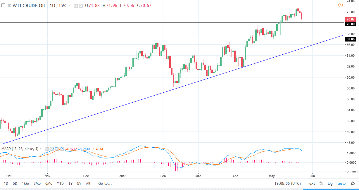 The WTI Crude Oil market broke down significantly during the trading session on Thursday, reaching down towards the $70.50 level, which is testing a major support level that extends down to the $70 level. If we were to break down below the $70 level, I think the market will unwind a bit from there. The US dollar has been strengthening, and of course there is talk that perhaps the OPEC cuts may end sooner rather than later, so that should bring more supply into the market. If we did break down, I think that the $67 level underneath is massive support, so I think we would find buyers in that area and a bit of a “reset.” I believe that the market should continue to be bullish if we get more noise coming out of the Iranian situation as well.