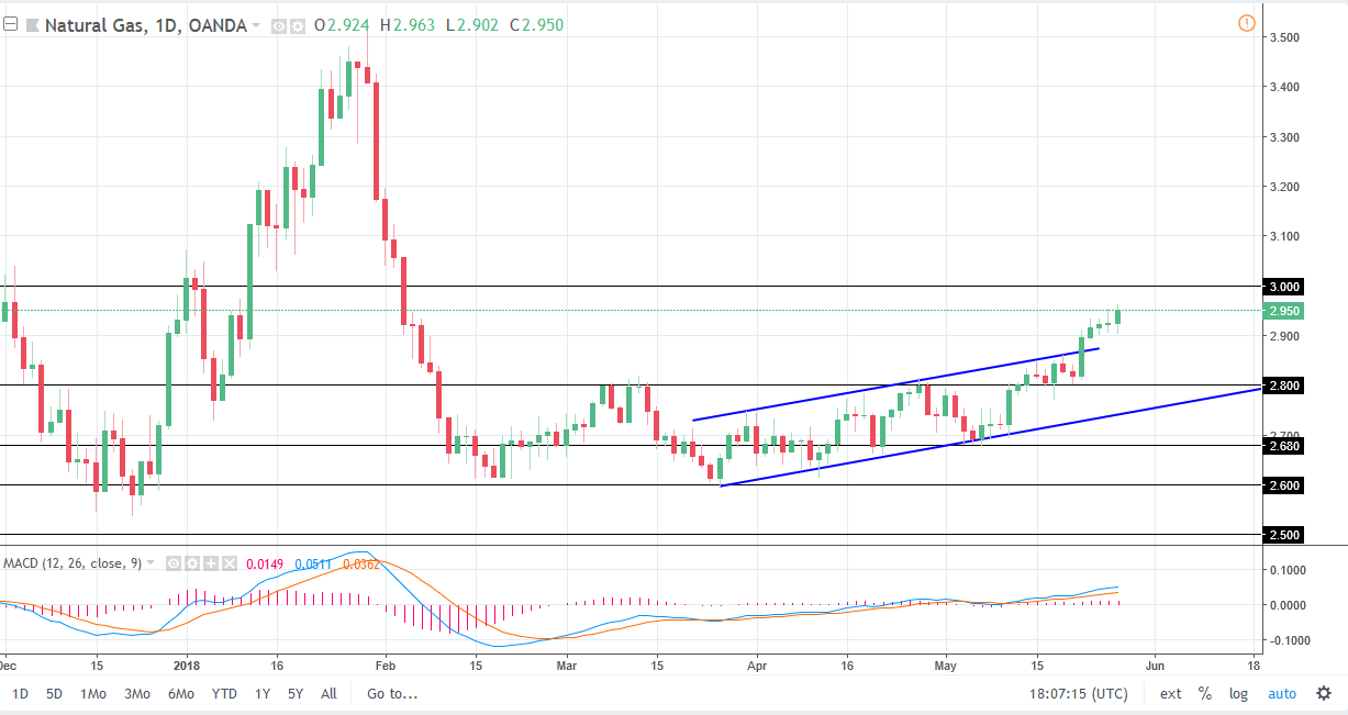 Natural gas markets initially fell during the day on Monday but turned around at the $2.90 level to find enough support to turn the market to the upside. Now that we have done this, it’s likely that the market will find resistance at the $3.00 level above, which is a psychologically important figure. If we break above there, then the next major barrier would be the $3.10 level. I’m looking for some type of exhaustion between here there to start selling, but the short-term market most certainly favors buyers. I think short-term traders can pick up little dips as an opportunity to take advantage of the futures market, but longer-term I think that we will eventually exhaust ourselves and start selling again. I will wait for a daily negative candle into resistance before I start selling.