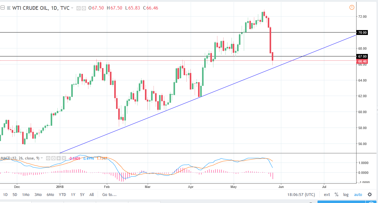 The WTI Crude Oil market fell significantly during the trading session on Monday, breaking below the $67 level. The liquidity could have been better of course, as it was Memorial Day in the United States. There is a massive uptrend line underneath, and that should continue to keep buyers interested in this market. We have seen a massive turnaround in the market, but I think if we can stay above this uptrend line, the market is likely to continue going higher eventually. I would wait for a move above the $67 level, before I put any money to work to the upside. On the other hand, if we were to break down below the $65 level, I am more than willing to start shorting this market, aiming for at least the $62 level underneath. I believe the next couple of sessions will be crucial for the trend.