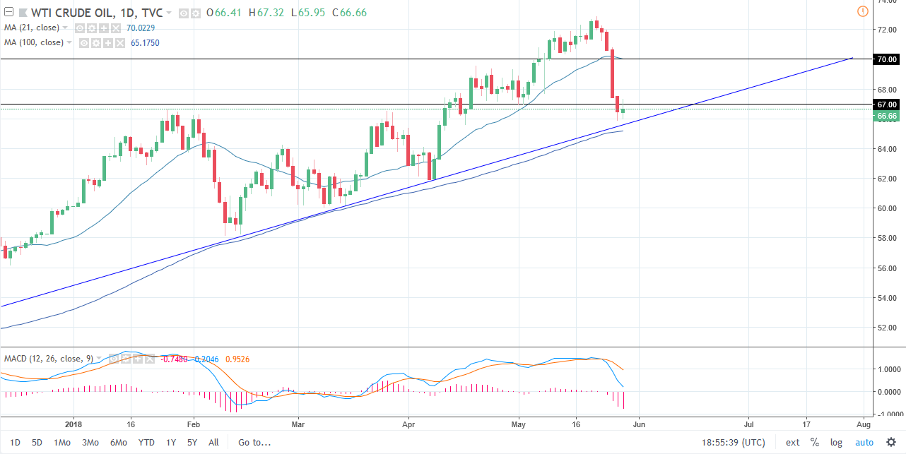 The WTI Crude Oil market has gone back and forth during the day on Tuesday, showing respect to the longer-term uptrend line and the 100-day simple moving average. I believe that the buyers are probably going to come into this market place and look for some type of value, as it has given up quite a bit of the gains that it had recently made. I like the idea of buying dips, and I believe it is only a matter of time before the rally continues. However, if we were to close below the $66 level on a daily chart, I think at that point we would probably unwind. There are rumblings a bounce production cuts being halted, and of course the US dollar has strengthened, both of which are bearish. However, there is still plenty of tension in the Middle East to lift this market as well.