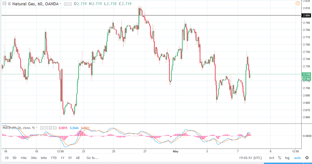Natural gas markets initially exploded to the upside during the day on Monday but found enough resistance at the $2.75 level to turn around and fall significantly. We are starting to see a bit of support at the $2.70 level, an area that was previous resistance. If we rally from here again, I will be looking to sell again at either to dollars $.75 on signs of exhaustion, or perhaps even the $2.80 level. Otherwise, we could continue to go lower, perhaps reaching down to the $2.68 level. Breaking down below the $2.68 level should send this market down to the $2.65 level, and then massive support at the $2.60 level. In general, I like selling this market on rallies, just as we have seen happen late in the day on Monday. Short-term traders continue to look to this market for nice selling opportunities.