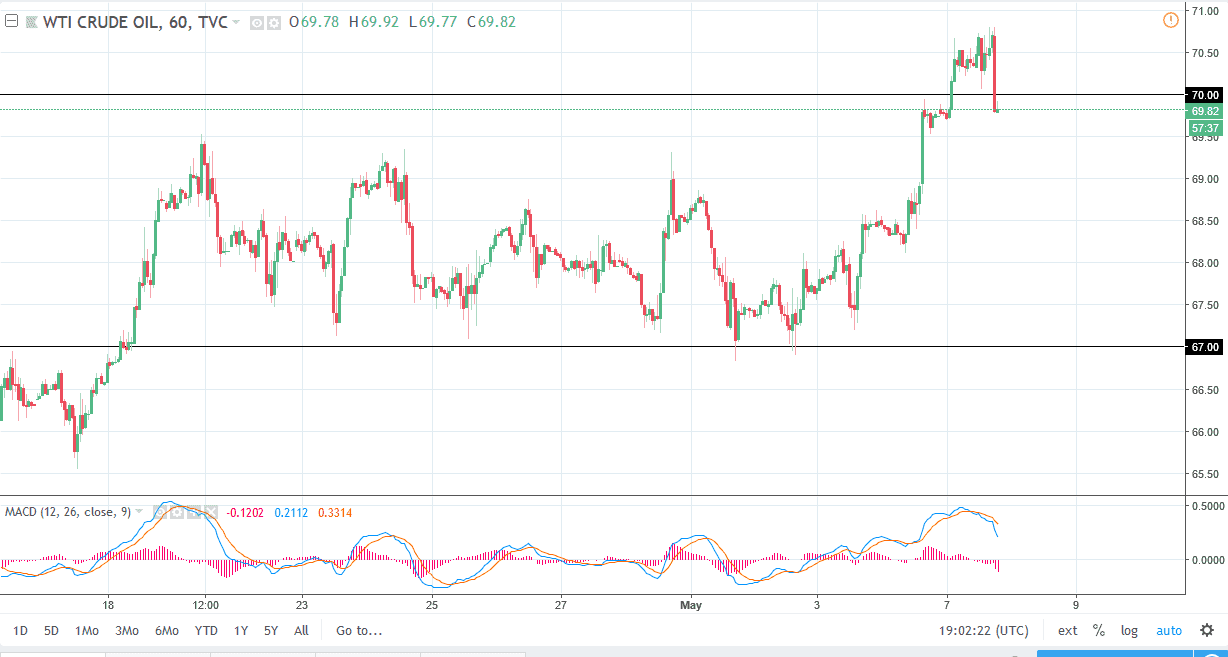 The WTI Crude Oil market was initially a bit positive during the day on Monday, but then broke down rather significantly to sliced through the $70 handle. By doing so, that shows an extreme reversal of attitude during the day, but I think that the support will run down to the $69 level. This not until we break down below there that I would be willing to sell, perhaps down to the $67 level. Otherwise, I anticipate a bounce rather soon, perhaps sending the market towards the $71 level, perhaps even the $72.50 level in the short term. Ultimately, this is a market that is reacting to headlines involving the Iranian nuclear deal, the US dollar, and many other external factors. Overall, the market continues to show positivity, so I think that we will see a general return to buying on the dips.