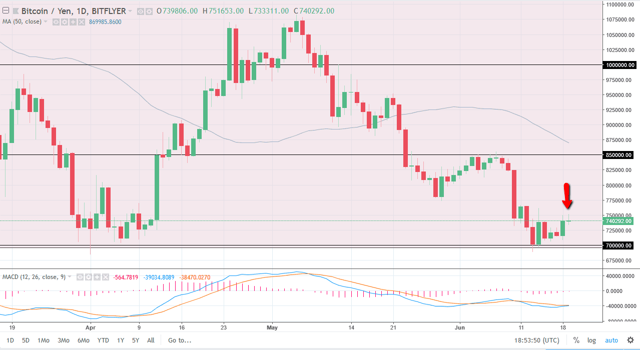 Bitcoin also tried to rally against the Japanese yen but seems to be struggling at the ¥750,000 level to form a candle very similar to the one against the US dollar. This show signs of exhaustion, and it shows signs that we will probably consolidate at the bottom of the overall consolidation area again. That has a floor of ¥700,000 underneath, but if that market gets broken it’s likely that we will go much lower, perhaps down to the ¥600,000.