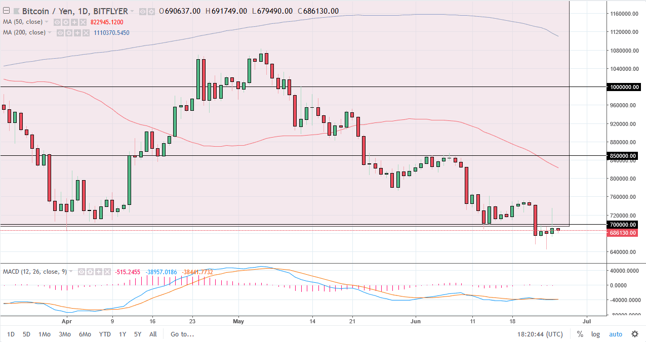 Bitcoin continues to hover below the vital ¥700,000 level, which of course is a very negative sign. We had formed a hammer on Sunday, shooting star on Monday, and now look like we are essentially stuck in this short-term range. The question now is whether we can hang on to this support, or do we break down from here. I suspect that eventually the market will break down below here. Rallies at this point are to be treated with suspicion, at least until we can break above the ¥775,000 level, something that we have failed to do recently. I think selling rallies will continue to pay those who are patient enough to wait for those opportunities, but if you are a longer-term investor you could look at these dips as potential value. All things being equal though, I think we go lower.