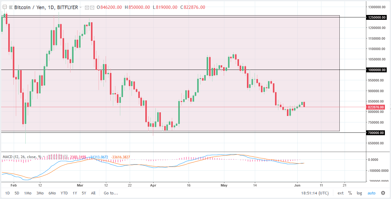 Bitcoin also fell against the Japanese yen as you can see, using the ¥850,000 level as resistance. The market looks likely to continue to go lower, perhaps reaching towards the ¥800,000 level, perhaps even reaching down to the ¥700,000 level. That is the bottom of this overall range, and I think it makes sense that we would test that area again. If we break down below the ¥700,000 level, that would be extremely negative as it would be yet another sign of weakness, and the fact that we could not reach the top of the consolidation area the last time we rally, gives me pause to think that we are in fact going to see a break down eventually. At that point, I suspect ¥600,000 would be the next target.