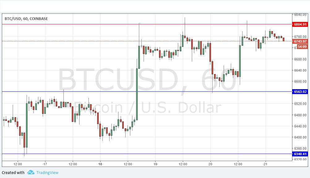 Yesterday’s signals produced a short trade following the bearish pin candlestick which rejected the resistance level at $6,805.