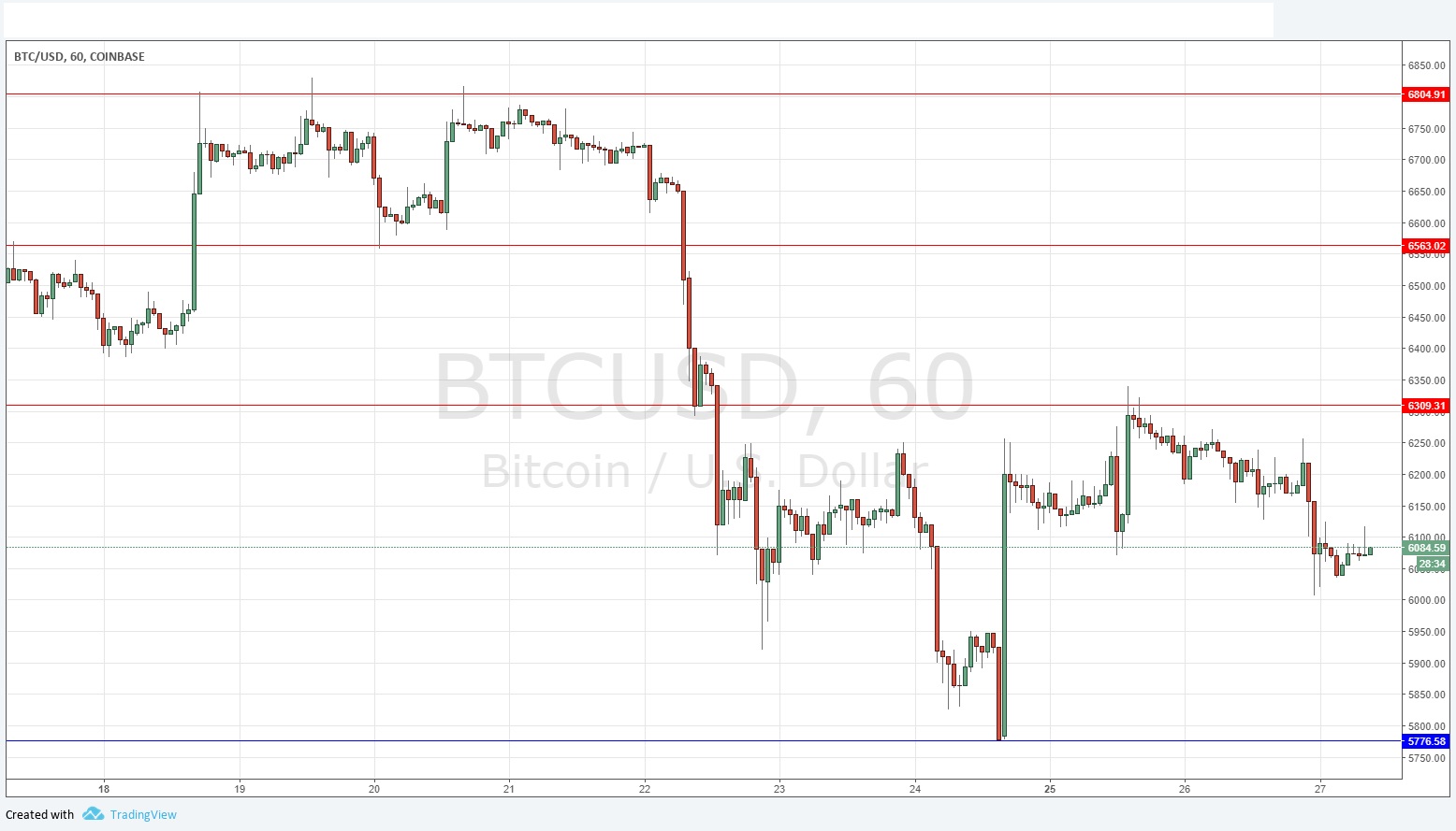 I wrote yesterday that I was uncertain as to the likely direction over the short-term. The price has continued to fall slowly from the resistant area, and there are early indications that the level of $6,100 may have become new, lower resistance, which would be a bearish sign. However, we are also seeing the start of a possibly bullish medium-term “over and under” formation, so the price still looks conflicted here and I can’t make a short-term call.
