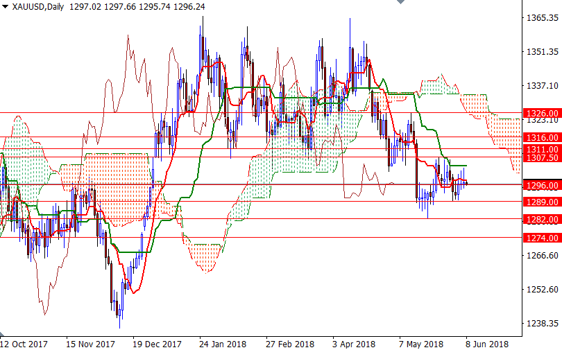 Gold prices are largely unchanged in early Asia trading today as investors remained cautious ahead of key events such as the G7 summit and the Federal Open Market Committee meeting. XAU/USD retested the resistance in the $1302-$1300 area before pulling back to the $1296 level. The U.S. dollar index continued to weaken yesterday but world stock markets were mostly higher, limiting buying interest in the safe-haven gold.