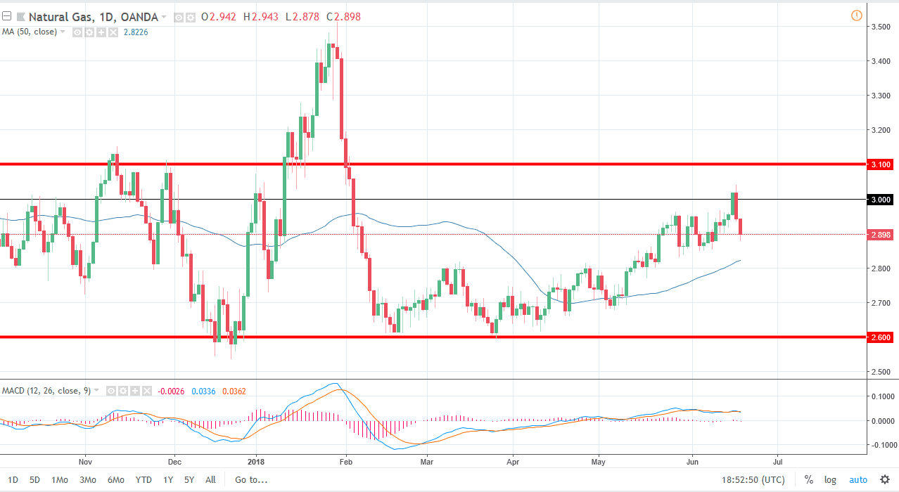 Natural gas markets fell rather hard during the day on Tuesday, breaking below the $2.90 level. We did bounce from below there though, so it’s likely that the market will continue to be very noisy, but the last couple of days have shown just how resistive the $3.00 level is. As you can see on the chart, I have a thick redline above there at the $3.10 level, and for me it looks as if that’s a significant resistance region. I believe that signs of exhaustion on rallies will be sold now, and if we can break down below the $2.85 level, the market will more than likely go down to the $2.80 level next.