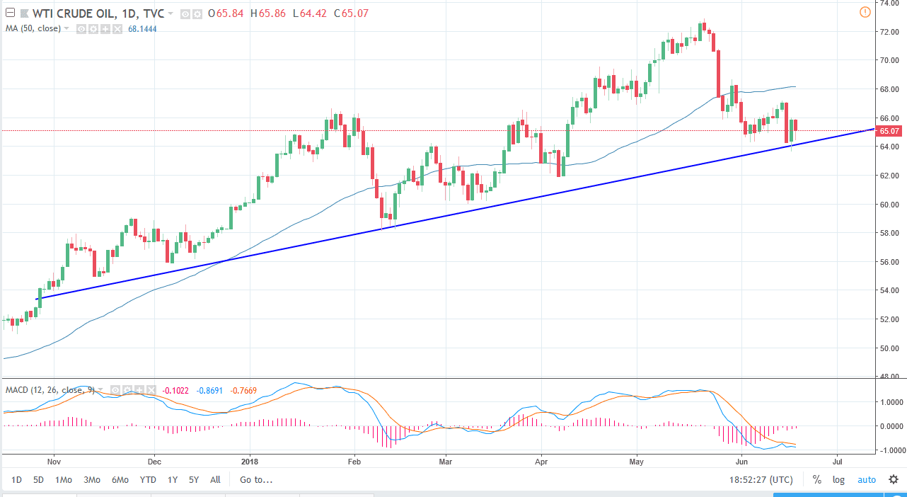 The WTI Crude Oil markets have been noisy during the trading session again on Tuesday, as we have tried to wipe out the gains from the Monday session. We are currently consolidating and walking along the uptrend line, and I think that should continue to be the case as we await the results of the OPEC meetings at the end of the week. It becomes obvious when looking at this chart through the prism of the daily timeframe that the $64 level is where we see a lot of support. If we were to clear that area, the market probably unwinds down to the $62 level. However, I suspect that over the next couple of days what we are going to be looking at is a lot of back and forth choppiness and scalping in both directions as we await an announcement as to whether OPEC will continue the production cuts.