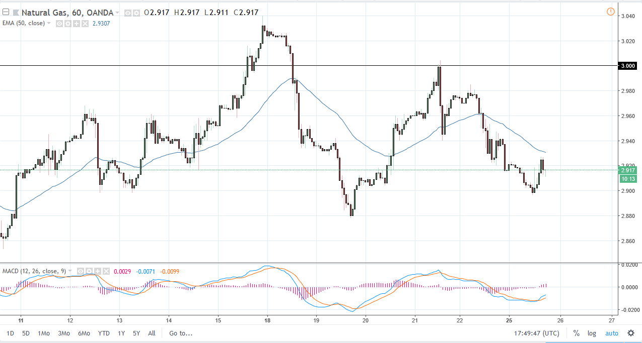 Natural gas markets pulled back a bit during the day on Monday but did recover some of the gains at the $2.90 level. There is a significant amount of support at the $2.90 level, but I think if we break down below there the market will drop down to the $2.88 level. If we rally from here, it will simply be another return to the overall consolidation that the market has been in. The $2.88 level being the very bottom of the range, and the $3.00 level above being the top of that range. There is a lot of noise in this market, as it is somewhat thin at times, and of course it follows the short-term trade reports. Overall, I would employ some type of range bound system between these levels over the next couple of days.