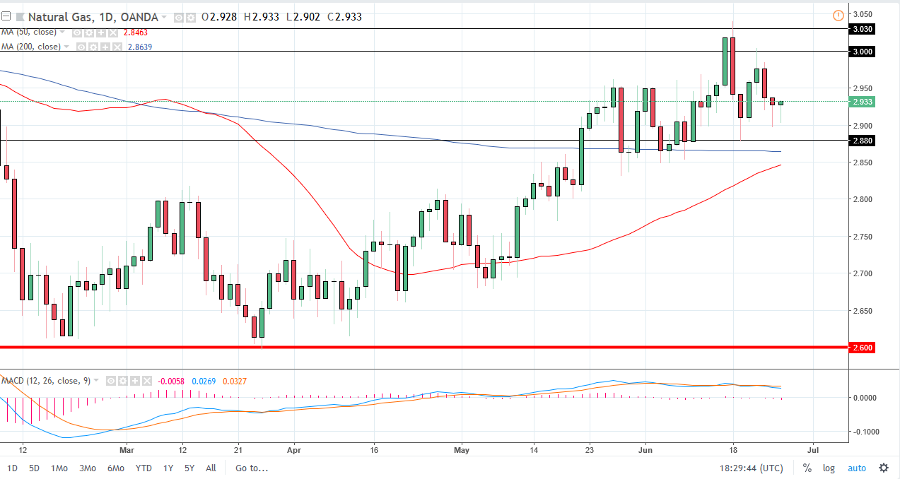 Natural gas markets initially fell during the trading session on Tuesday but found enough support near the $2.90 level to turn around of form a hammer for the second day in a row. That’s a very bullish sign, and I think this shows that we are about to have a bit of a bounce. However, I also recognize that there is a significant amount of resistance above, so I think that it is only a matter time before the sellers return. I think short-term buying positions that will be followed by selloffs is probably going to be a staple of what we are about to witness. I think sideways action with a proclivity to break back down makes sense though, because quite frankly the market is oversupplied longer-term. The $3.00 level above continues offer a bit of resistance.