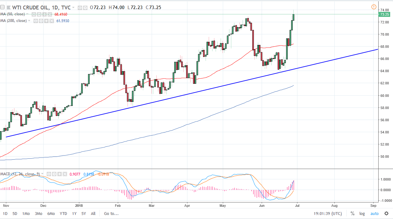 The WTI Crude Oil market rallied a bit during the session again on Thursday, reaching towards the $74 level. We are extraordinarily bullish, and I think that will continue to be the case. However, we are most certainly overbought, so a short-term pullback makes sense and I think should be thought of as value. I’m using the 50 EMA as a potential support level, but I would also pay close attention to the $70 level as well. I certainly wouldn’t short this market, although I would anticipate some type of pullback. This is a very strong market currently, and therefore I don’t have any interest in trying to go against it. In fact, while the US dollar has been strengthening, oil seems to be ignoring that, showing just how bullish this market truly is.