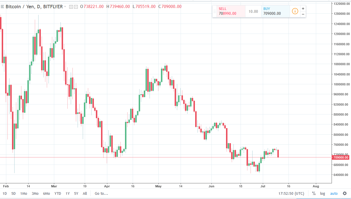 Bitcoin also fell against the Japanese yen as you would expect, breaking down below the ¥725,000 level. I think that the market breaking below the ¥700,000 level would be a sign that we are going to the lows again, perhaps reaching down to the ¥650,000 level. The ¥750,000 level above continues offer resistance, and it now looks as if we will continue to see a lot of negativity, and therefore I believe that these rallies continue to be opportunities to start shorting again. This flies in the face of the Forex markets, which have seen the Japanese yen lose value, so if Bitcoin can gain against one of the weaker currencies that I follow, it shows just how soft this market is. I would anticipate fresh, new lows in this market over the next couple of weeks.