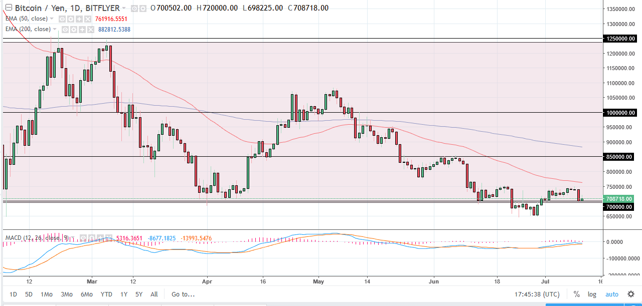 Bitcoin bounced slightly against the Japanese yen as well, using the ¥700,000 level as support. This is an area where we have seen some buying as of late, but again, just as in the BTC/USD pair, most of the impulsivity is to the downside. That tells me more than anything else on this chart. Buyers simply do not have the conviction to pick this market up, and I think it needs to break down even further before we get a complete capitulation, something that is needed for this market to finally turn around the overall trend. At this point, I don’t think we are close to it. However, I will of course monitor for changes in the overall attitude of the markets, but right now things look pretty gloomy to say the least.