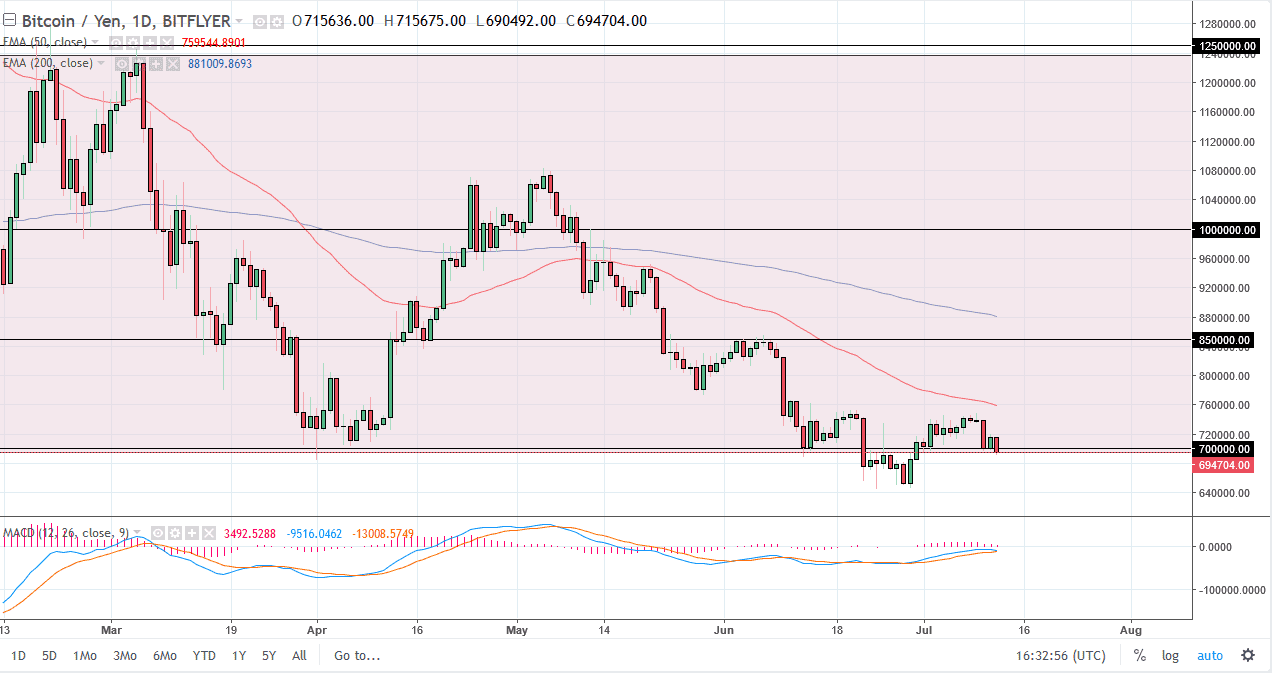 Bitcoin of course also fell against the Japanese yen, and it looks as if we will go looking towards the lows again, near the ¥650,000 level. If we break down below that level, the market probably goes down to the ¥600,000 level next, perhaps even lower than that. Given enough time, I believe that the ¥500,000 level will probably be a target, and I believe that the 50 day EMA is going to continue to be a resistive barrier. In fact, I don’t have any interest in buying right now, at least not until we break above the ¥850,000 level. That could change of course with the right impulsive move, but currently I don’t see enough demand to change my mind. I believe that ultimately we will break down.