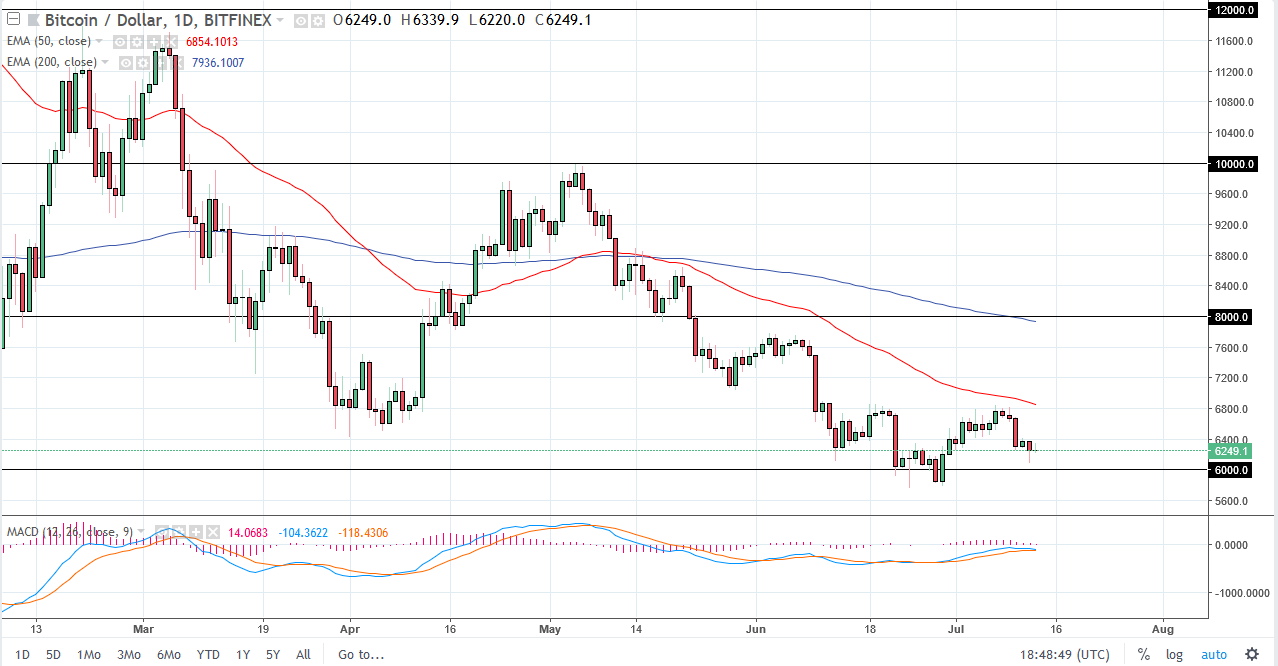 Bitcoin initially tried to rally during the trading session on Friday but rolled over at the $6400 level again. This is a market that simply cannot pick up any momentum, and as we roll into the weekend it’s likely we may get some bot trading, but beyond that I think there are a lot of people concerned about their cryptocurrencies right now. The $6000 level is a major support level and has been broken a couple of times recently. Even if we were to rally from here, I suspect it’s only a matter of time before the sellers get involved, and they move below the lows will of course send this market much lower. The market simply cannot pick its feet up. I believe that $8000 above is a massive barrier that will be overcome without some type of serious fundamental change.