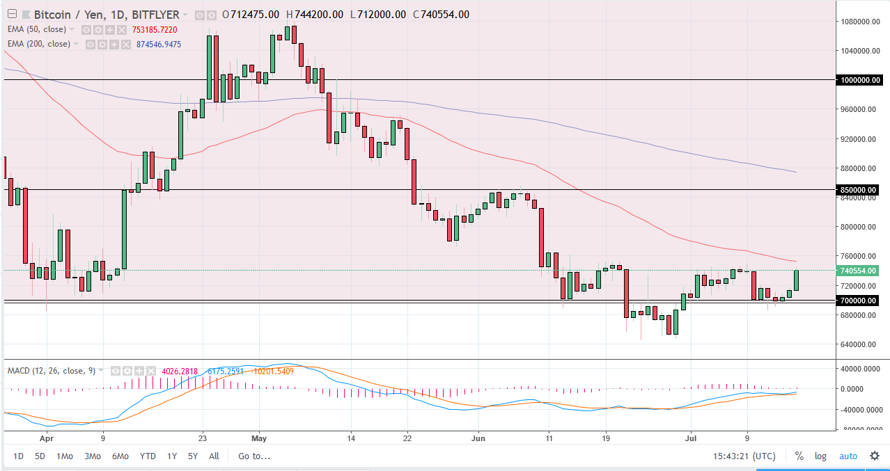 Bitcoin also rallied against the Japanese yen, and as I record this looks likely to reach towards the ¥750,000 level. I think if we can break above the 50 day EMA, the market will probably continue to go higher, perhaps reaching towards the ¥825,000 level, maybe even ¥850,000 after that as it is a scene where a lot of sellers came into the market. If we cannot break above the 50 EMA clearly, I think that we will probably pull back towards to the ¥700,000 level, maybe even as low as ¥650,000 after that. I think at this point, it looks as if the market is trying to form a bit of a bottom, so if you are a longer-term trader this might be a nice opportunity. However, I would expect a lot of noise in this market as well.