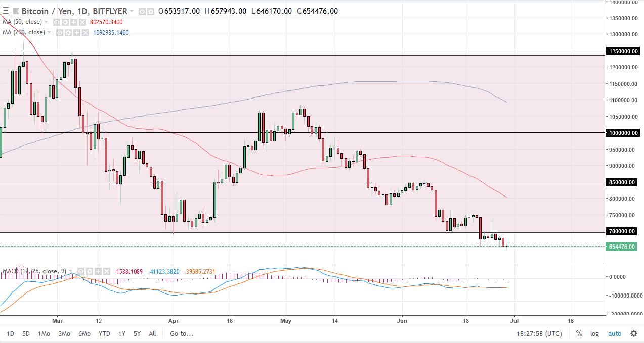 Bitcoin has also struggled against the Japanese yen as of late, essentially doing nothing during the day on Friday as we are hovering just above the Sunday hammer for last week. If we break down below the bottom of the hammer, and it certainly looks as if we are getting ready to do, the market is likely to go much lower, perhaps down to the ¥600,000 level, and then the ¥500,000 level. It is very difficult to imagine a scenario where this market rally significantly, and I believe that it will take a lot to break above the ¥750,000 level, as it has been resistance recently. Even if we break above there, the market would probably go to the ¥850,000 level where we find even more resistance. Bitcoin looks very weak currently, and I see nothing changing anytime soon. Sell rallies whenever you get a chance.